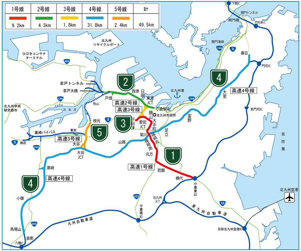 福岡高速・北九州高速は、福岡・北九州両都市圏の道路網の骨格となる自動車専用道路であり、市街地部の交通渋滞を緩和し、道路交通の円滑化に寄与しています。また、九州自動車道など広域的な高速道路ネットワークとも接続し、両都市圏間や本州、九州の各方面とのアクセス向上の役割も果たしています。