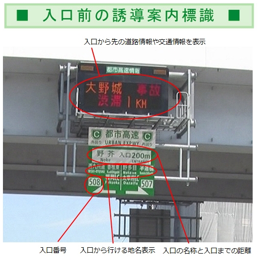都市高速では、目的地や通過地の方向、距離、道路上の位置を示す案内標識を設置しています。